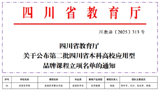 近日,四川省教育厅公布了第二批四川省本科高校应用型品牌课程立项名单,由我校基础医学院杨拯教授主持,陈环宇、张先琴、刘沙、徐艳、张晓等老师参与建设的《基础医学整合实验》课程凭借鲜明的特色、创新的教学模式以及较好的育人成效成功立项,是学院课程建设方面的又一重要成果。