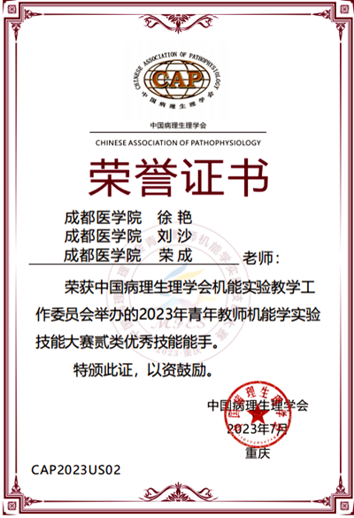 我校机能实验教学团队参与本次竞赛得到学校大力支持,由基础医学院徐艳、荣成、韦晓亮和药学院刘沙老师组成三支参赛队伍,经充分准备代表我校参赛。经过理论和实操两轮比赛,最终徐艳、刘沙、荣成(休克组)获得“2023年青年教师机能学实验技能大赛贰类优秀技能能手”(二等奖),徐艳、韦晓亮(大鼠组)获得“2023年青年教师机能学实验技能大赛贰类优秀技能能手”(二等奖),荣成、刘沙(家兔组)获得“2023年青年教师机能学实验技能大赛叁类优秀技能能手”(三等奖),取得了优异的成绩。