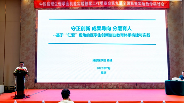 7月19日,第九届全国机能实验教学研讨会在重庆假日酒店报告厅3楼宴会厅举行。重庆医科大学邓世雄副校长、教育部学校规划建设发展中心李平主任、中国病理生理学会副理事长高钰琪教授、中国病理生理学会机能实验教学工作委员会主任委员范小芳教授分别致辞。在大会报告环节,11位知名专家教授受邀围绕打造基于知识图谱的数字化教学新生态、智慧化数字化技术实验中的应用、基础-临床整合式教学、医学生创新创业教育和构建实践育人体系培养新时代基础医学高质量创新人才等方面作了精彩报告。我校杨拯教授应邀作了题为《基于“仁爱”视角的医学生创新创业教育体系构建与实践》的报告,介绍了我校和该团队在“仁爱”视角下开展本科创新创业教育教学的具体做法、经验与成效,得到与会专家老师的广泛共鸣。