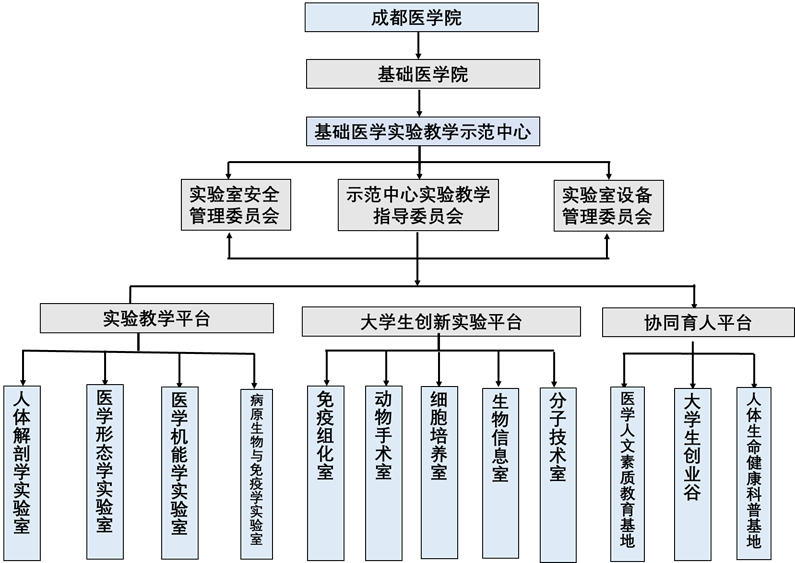 基础医学实验教学中心(后简称“中心”)始建于2007年,为四川省首批省级教学示范中心,由医学形态学实验室、病原与免疫学实验室、医学机能学实验室和解剖学实验室等教学实验室及大学生创新实验室、协同育人平台组成(图1)。“中心”建筑面积12,144m2,拥有中国数字人解剖系统、Motic数码显微互动教学系统、泰盟BL-422I实验教学系统、全自动扫描显微镜、荧光定量PCR等教学及科研设备,总值7,641 万元。
