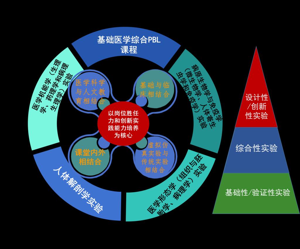 依托基础医学实验教学平台、虚拟仿真实验教学平台、大学生创新实验平台及协同育人平台,“中心”形成了“1核心、5模块、3层次”和“4结合”的渐进式多元化实验教学模式(图3),全面提升学生的实操技能、自主学习能力、综合素质及创新实践能力。